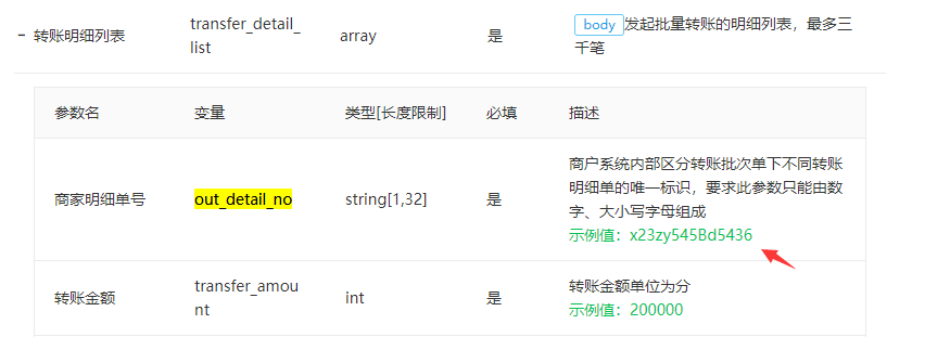 商家转账接口支持给单用户付款,报错:"输入源“/body/transfer_detail_list/0/out_detail_no”映射到值字段“商家明细单号”字符串规则校验失败,字符数 1,小于最小值 5,这是out_detail_no字段最低不能小于5