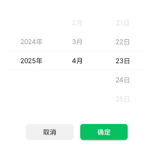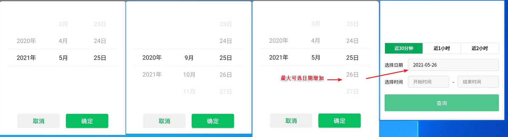 日期选择器设置最小和最大可选时间,举例:start:2020-9-1 end:2021-5-25 来说。点击弹出时间选择器,滑动到上一个年份2020,会自动显示对应的月份和天数(此时联动正常)。当返回到 2021年最大可选年份时,最大可选月份正常显示,最大可选日期增加(异常)