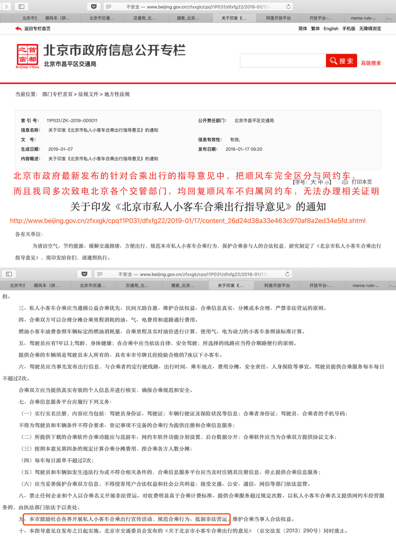 下图是北京市政府2019年1月7日印发的《北京市私人小客车合乘出行指导意见》,全文未提及需要办理备案证明。