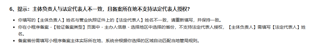 复用的小程序是备案过的,结果在同主体下,复用此小程序的备案信息,显示主体负责人与法定代表人不同,且备案所在地不支持法定代表人授权。