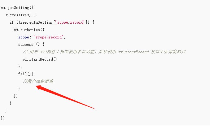 wx.getSetting({ success(res) { if (!res.authSetting['scope.record']) { wx.authorize({ scope: 'scope.record', success () { // 用户已经同意小程序使用录音功能,后续调用 wx.startRecord 接口不会弹窗询问 wx.startRecord() }, fail(){ //用户拒绝逻辑 } }) } } })