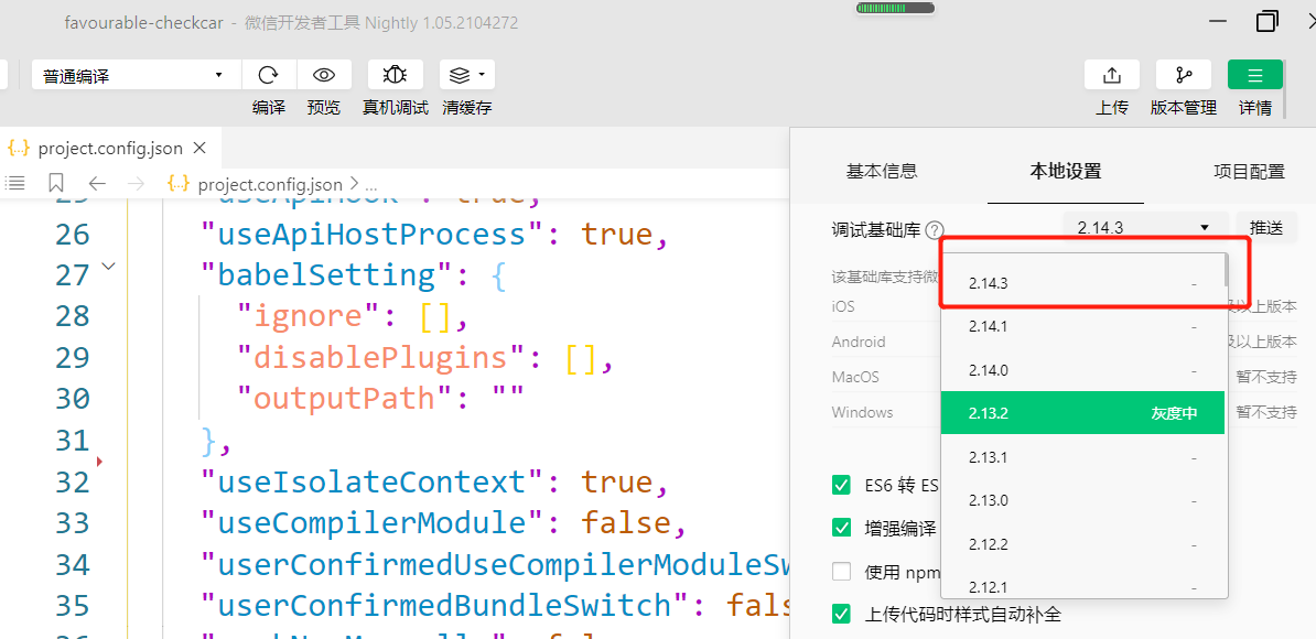 最高只能选到2.14.3,可是现在基础库已经到2.17.0了,在工具上并未出现2.14.3以上版本的选项