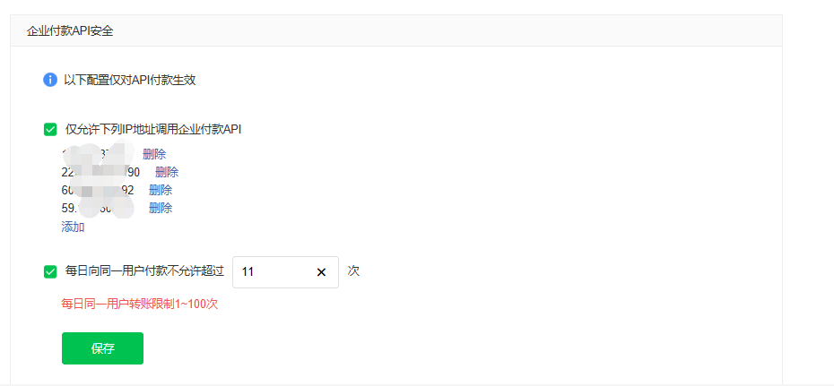 企业付款到银行卡,之前调用没有问题,后来换了一个服务器,在微信支付商户平台也配置了IP地址,但是调用就一直提示:此IP地址不允许调用接口,如有需要请登录微信支付商户平台更改配置