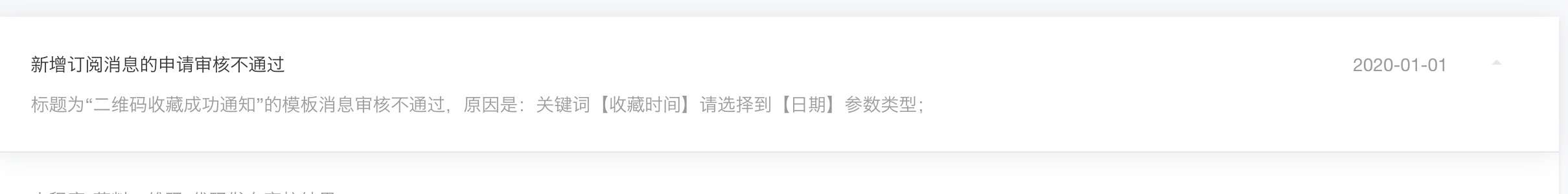 这个是上周我们提审的模版,今天反馈给我审核不通过,原因是我们在【收藏时间】关键词没有使用【日期】参数类型,但是我在提审时确确实实选择的是【日期】类型。。这个该怎么办?有没有官方大大回复一下这种情况要怎么样修改才能再次提审?每次提审都要3-4天,不敢在浪费机会了。。功能急着用,谢谢大佬们,帮助一下。