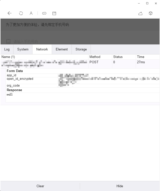 如图所示,这是在公众号中的一个H5页面,访问接口的时候,返回的状态码一直是0,response为null。