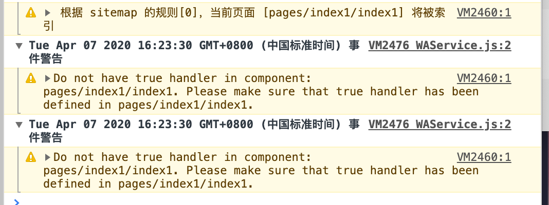 警告:VM2398:1 Do not have true handler in component: pages/index1/index1. Please make sure that true handler has been defined in pages/index1/index1.