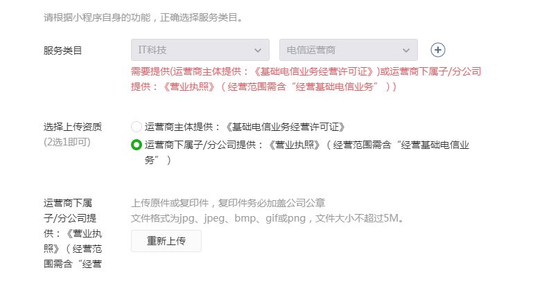 你好,IT科技-IT科技 类目需提供《基础电信业务经营许可证》;详情可参考链接:https://developers.weixin.qq.com/miniprogram/product/material.html#%E9%9D%9E%E4%B8%AA%E4%BA%BA%E4%B8%BB%E4%BD%93%E5%B0%8F%E7%A8%8B%E5%BA%8F%E5%BC%80%E6%94%BE%E7%9A%84%E6%9C%8D%E5%8A%A1%E7%B1%BB%E7%9B%AE