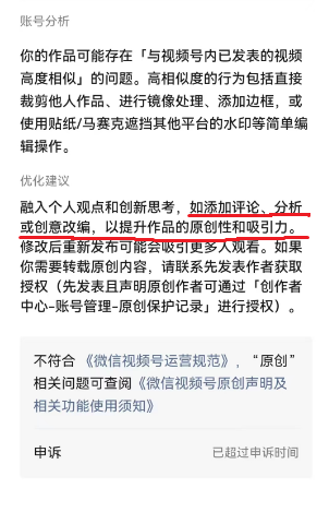 但哪怕是高度创作(如添加AI解说 文字评论等)的作品 也没办法通过原创审核 申述时并带上视频工程的图片说明也不会通过 而理由都是是否已获权利人授权