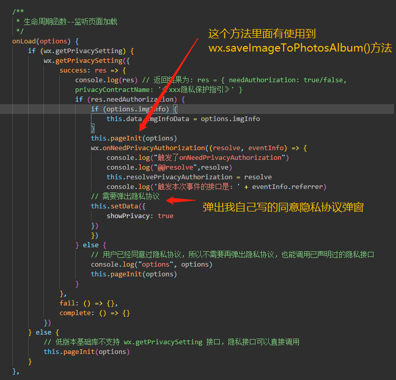 1.在onLoad里面,先判断了 wx.getPrivacySetting,调用之后,如果res.needAuthorization为true,就调用了wx.saveImageToPhotosAlbum()方法,这个方法会触发到用户隐私那个授权要求,然后继续写了wx.onNeedPrivacyAuthorization事件,因为调用了wx.saveImageToPhotosAlbum()方法,所以wx.onNeedPrivacyAuthorization监听到了,然后我弹出了自己写的同意隐私保护的弹窗【代码见图1】,