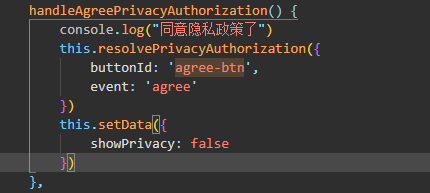 2.【图2是我自己写的隐私弹窗】点击了同意按钮之后,<button class="btn agree " id="agree-btn" open-type="agreePrivacyAuthorization" bindagreeprivacyauthorization="handleAgreePrivacyAuthorization">同意</button>,触发了this.resolvePrivacyAuthorization({})方法【见图3同意之后逻辑】,但是这时候弹出了一个我没写过的弹窗【见图4】,让我授权具体接口的功能,