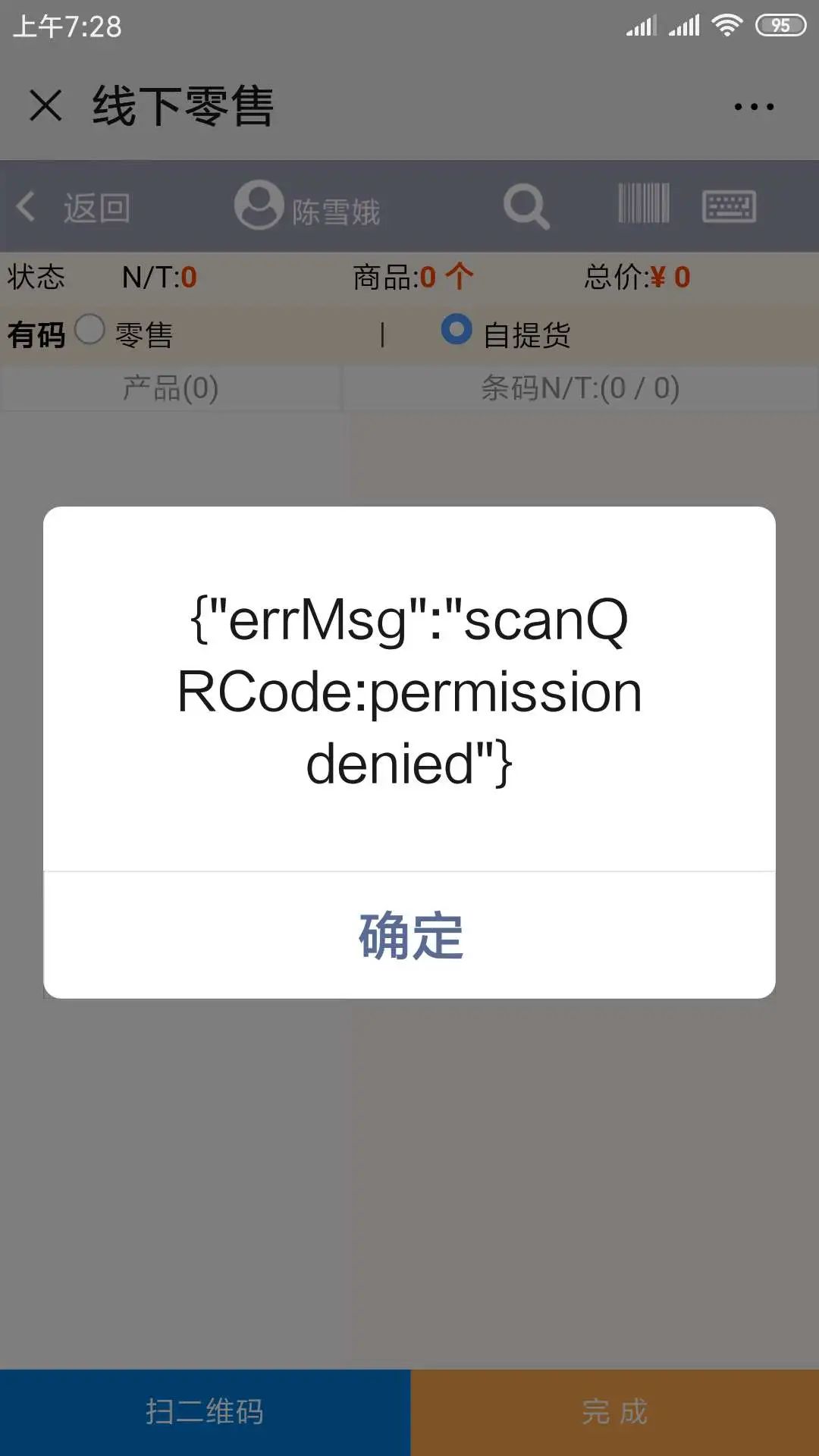 微信版本:Android 7.0.15 H5 页面调用 ( scanQRCode ) 异常返回 scanQRCode:permission denied
