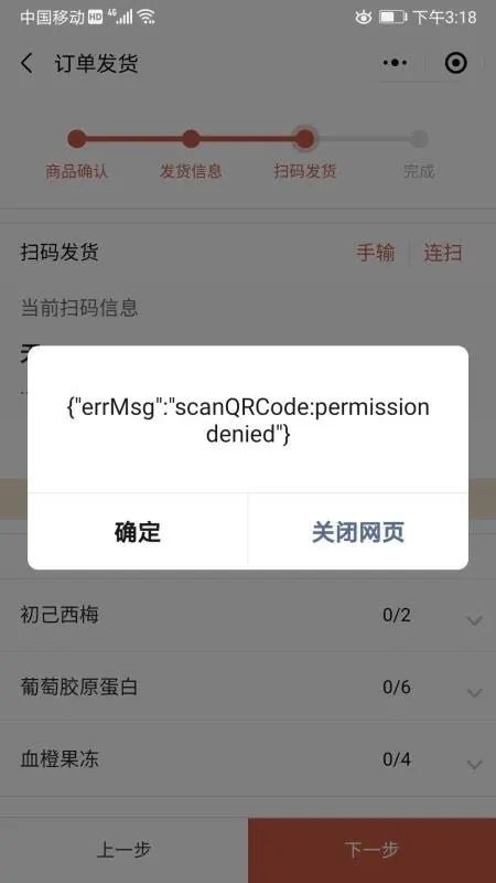 提示信息如下图:errMsg:scanQRCode:permission denied.