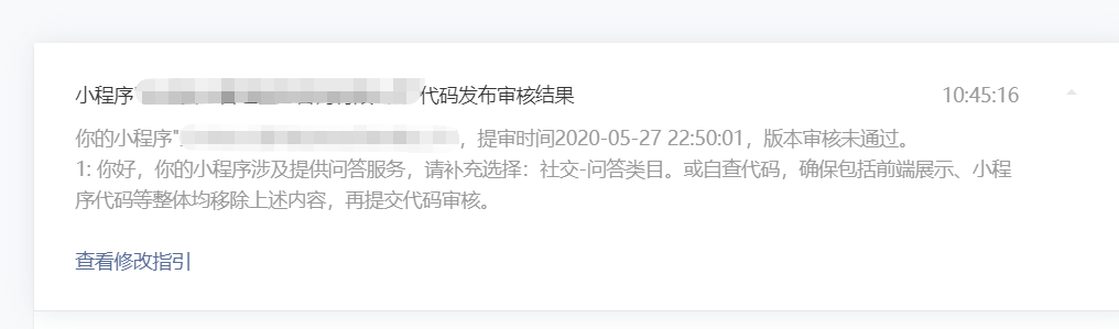 你好,经核实,小程序涉及提供问答服务,需要补充选择社交-问答类目或自查代码,确保包括前端展示、小程序代码等整体均移除上述内容,再提交代码审核。