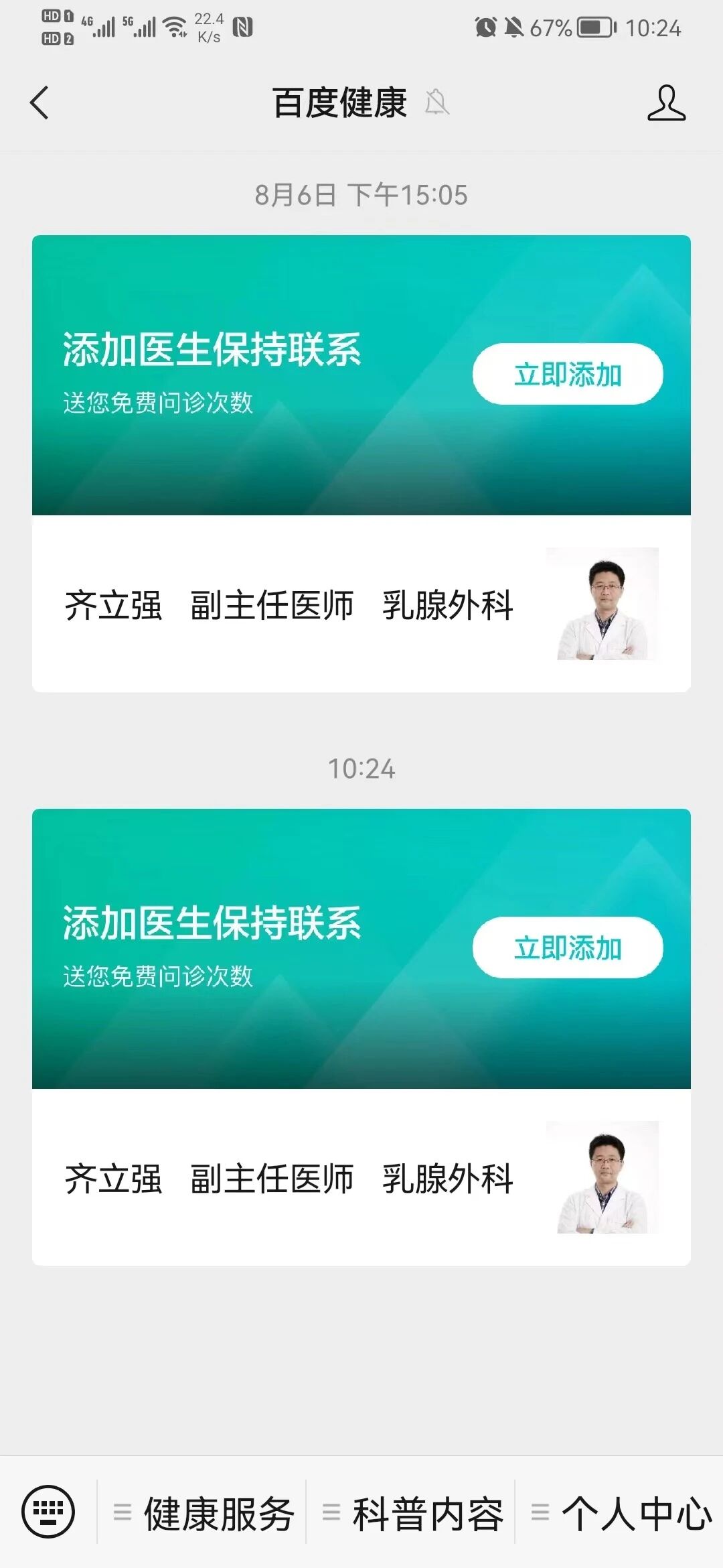 现在有个需求,就是用户扫描二维码,关注公众号之后,立马就给用户推送一条图文形式的消息,但是我看模板消息只能推送文字内容的消息呀,怎么推送类似下面那种,图文卡片的消息,我看这个百度健康就是,扫描医生对应的公众号二维码,关注这个公众号,会推送一个医师卡片,这个卡片用模板消息也没法做呀