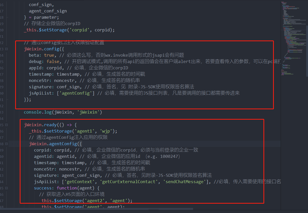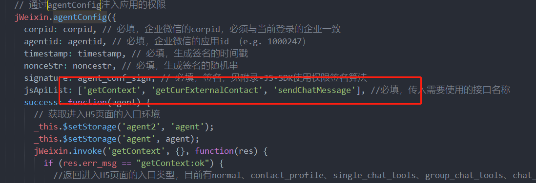 setTimeout(() => { wx.agentConfig({ corpid: _this.data.corpid, // 必填,企业微信的corpid,必须与当前登录的企业一致 agentid: _this.data.agentid, // 必填,企业微信的应用id (e.g. 1000247) timestamp: _this.data.timestamp1, // 必填,生成签名的时间戳 nonceStr: _this.data.noncestr1, // 必填,生成签名的随机串 signature: _this.data.agent_conf_sign, // 必填,签名,见附录-JS-SDK使用权限签名算法 jsApiList: ['getContext', 'getCurExternalContact', 'sendChatMessage'], //必填,传入需要使用的接口名称 success: function(agent) { // wx.ready(function() { // resolve(agent); // }) } }); }, 500)2.把agentConfig放在config的ready方法中即可。