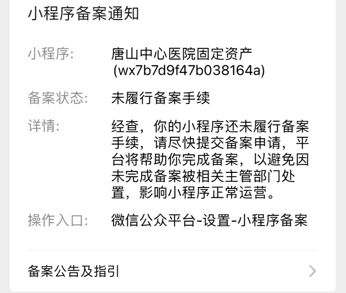已上架未完成备案的小程序将被相关主管部门按照规定处置,或将影响小程序正常运营,请开发者尽快完成备案。后续请开发者持续关注平台的公告、通知、站内信及模板消息等渠道。