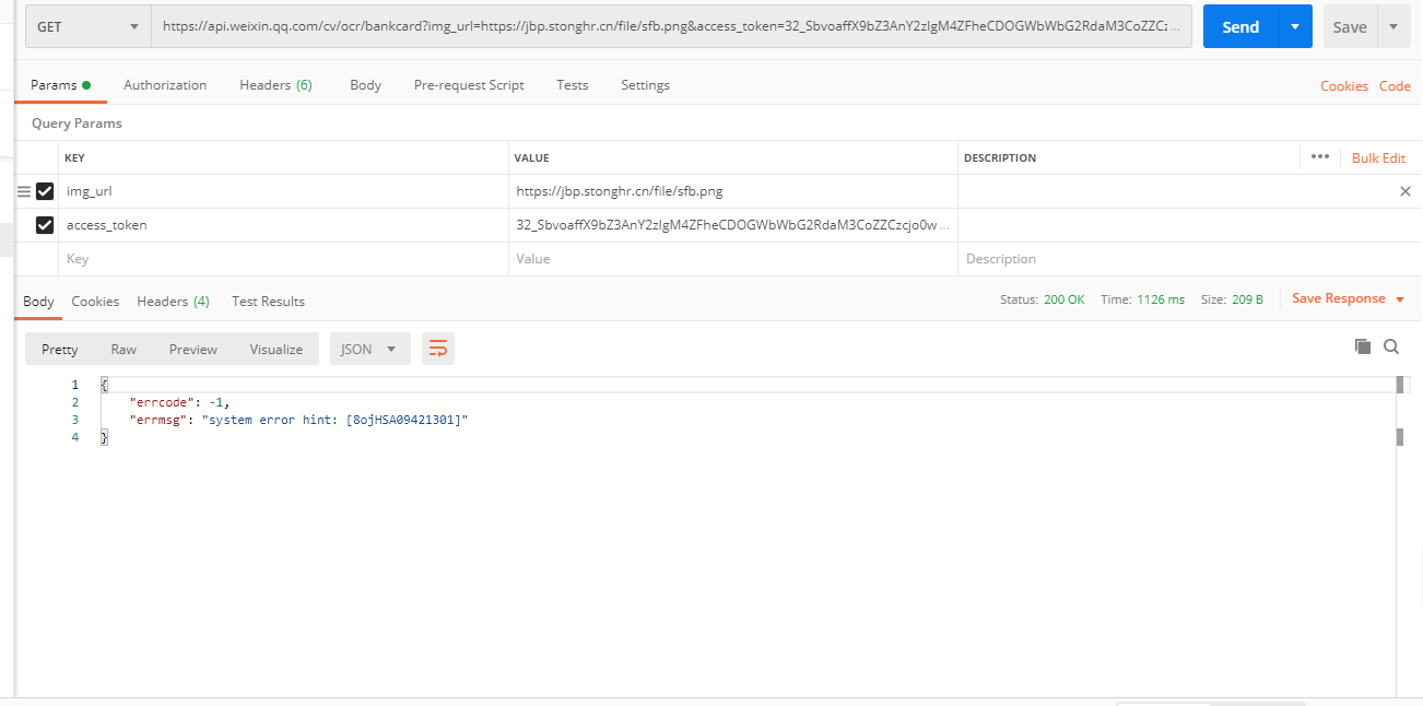 测试路径:https://api.weixin.qq.com/cv/ocr/bankcard?img_url=https://jbp.stonghr.cn/file/sfb.png&access_token=32_SbvoaffX9bZ3AnY2zIgM4ZFheCDOGWbWbG2RdaM3CoZZCzcjo0woT461g_7qEXPU_awfbTmtYuAWArUMmNIFXqlf-h-qu_Da5d1uVlmLFyn7lStU923RpHcbeMRfe_y04FUj8fcH9oz8Xk-PMOHcAJAXZS