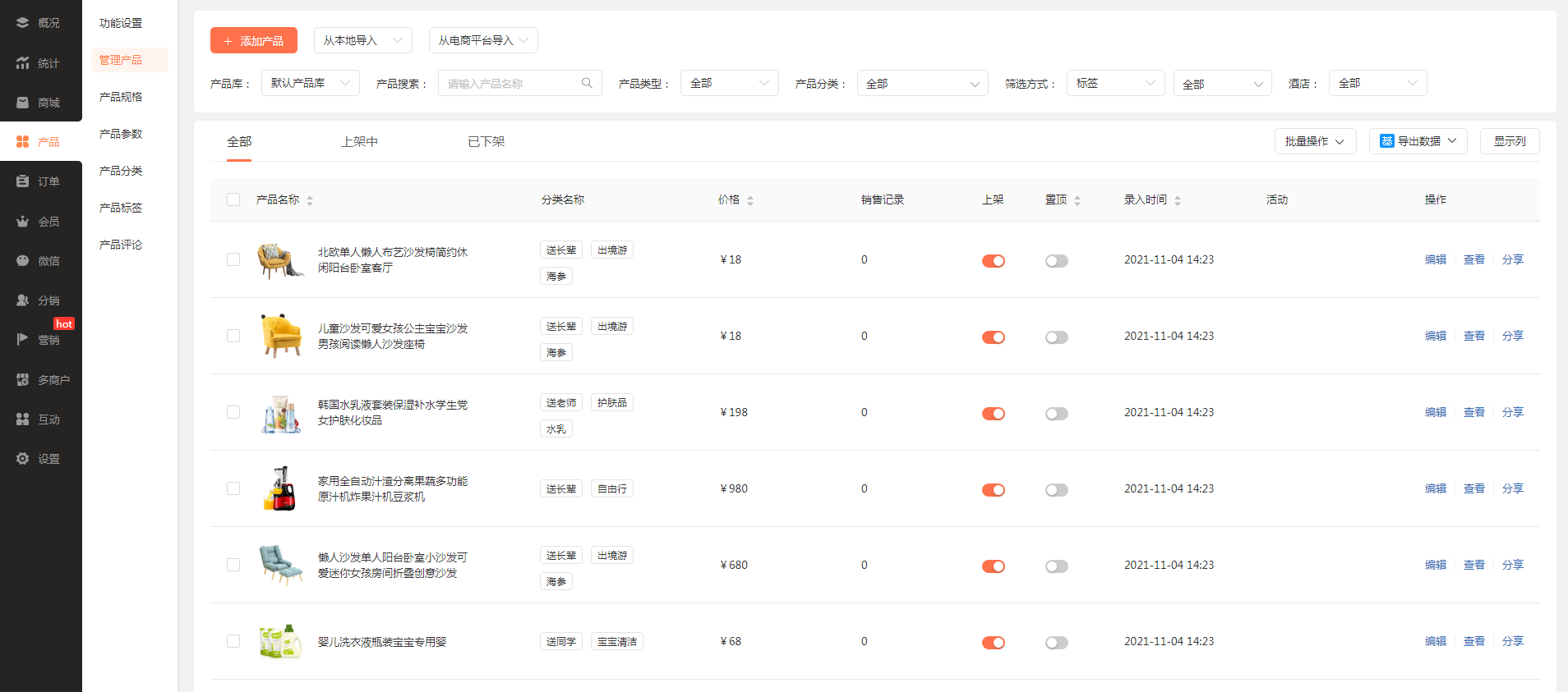 2、如果是使用第三方平台(https://mall.fkw.com/mallApp.html?_ta=9282)自己套用模板制作商城小程序的话,那就更加简单了。只需要登录到第三方平台的后台,找到对应选项,就可以更新商品,还能一键导入商品。