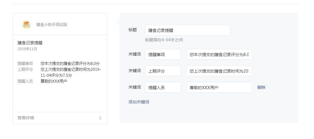 该号提交了新模板申请,标题【膳食记录提醒】,驳回原因如下:1)模板申请审核会评估模板的内容和使用场景是否合理,并非所有模板都能入库,对于存在骚扰、营销、滥用倾向的场景不支持入库;2)请运营者正确理解平台的模板消息接口能力。模板消息是一个即时消息通知,是给用户提供服务后的服务凭证通知,不作提醒用途。3)模板消息运营规范https://mp.weixin.qq.com/wiki?t=resource/res_main&id=mp1433751288