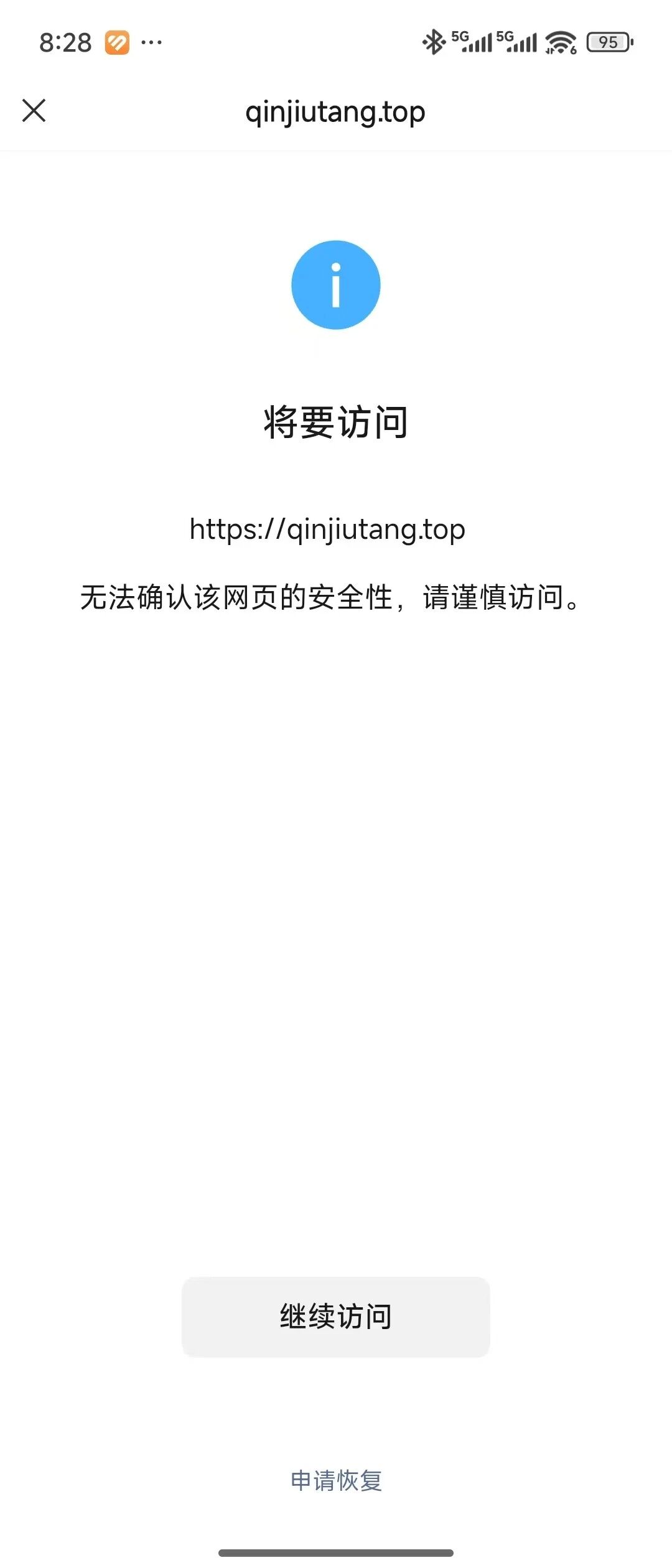 您好,域名https://qinjiutang.top备案通过,浏览器访问正常,我是网站开发者,访问时间如图2025/5/30,微信访问网站出现“无法确认该网页的安全性,请谨慎访问”,经检查网页里没有不安全的内容,请核实后帮忙解除拦截,谢谢!