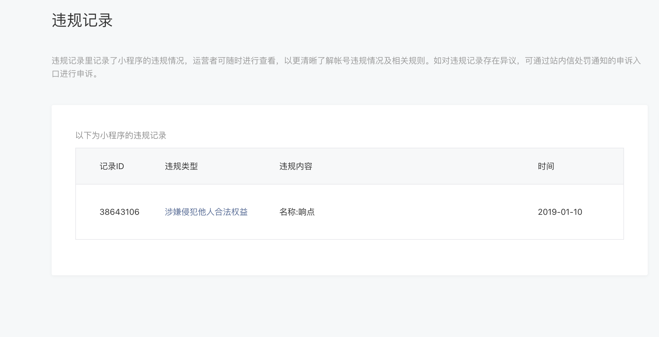 我们的的产品半年内并没有违规记录,只是在2019年的时候有一个侵权记录,但是时间已经过去好长时间了,为什么开通的时候还是提示半年内有违规记录呢,是否为官方的bug呢?