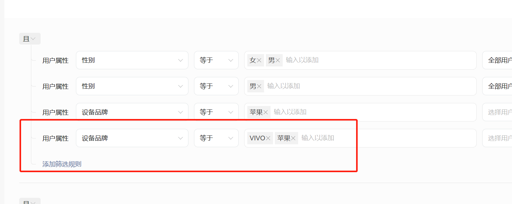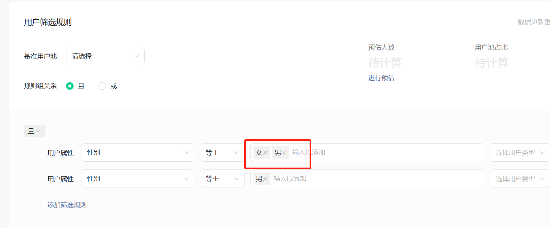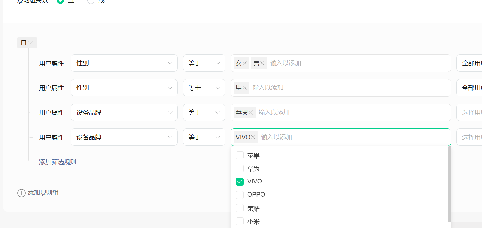 新建人群时,人物属性等于单选男时,可以正常,但是选择女就老是会自动添加上男?很是奇怪,选择设备时,也老是会自动加上苹果,不知道是什么情况?