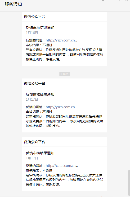 britto.com.cn,catai.com.cn,yszh.com.cn ,lcfa.com.cn 这四个域名刚刚购买,被微信提示拦截,我多次申诉被驳回,理由就是仍然存在违规,不予解封!!我真不明白腾讯的的客服就是这样瞎着眼审核吗?域名都没有解析,网站都没有,空间都没有,压根打不开,怎么瞎着眼说仍然存在违规呢?试问腾讯的微信团队就是这样服务的吗?麻烦睁着眼审核一下!!!