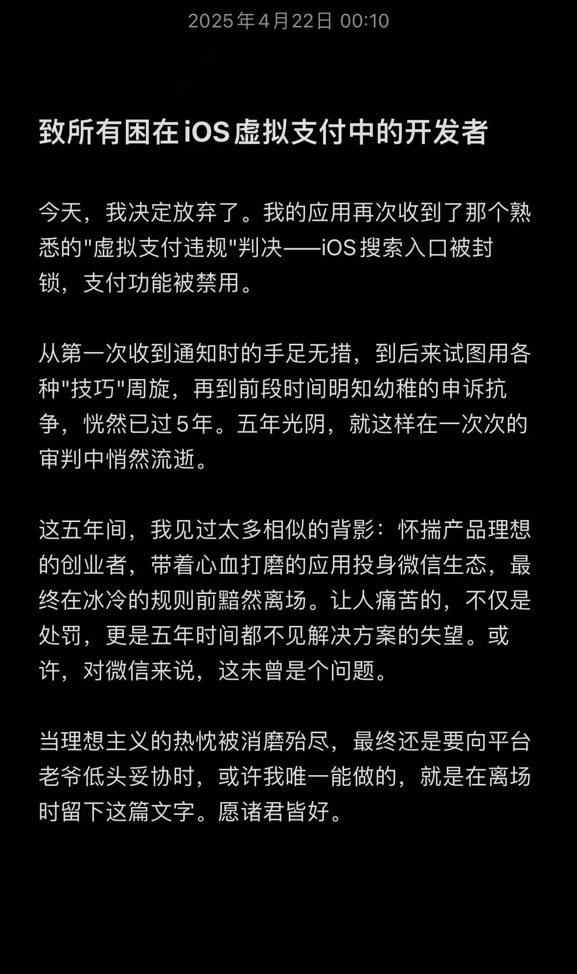 今天,我决定放弃了。我的应用再次收到了那个熟悉的"虚拟支付违规"判决——iOS搜索入口被封锁,支付功能被禁用。