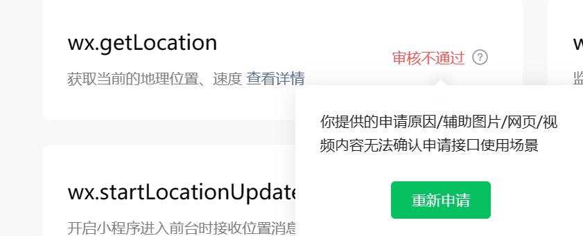 你好,核实到小程序申请wx.getLocation接口审核不通过,根据提交的申请信息可知申请该接口是用于【使用用户当前地理位置方便用户添加收获地址】,不符合wx.getLocation接口使用场景开放范畴。建议使用wx.chooseLocation或wx.choosePoi也可以实现上述场景。