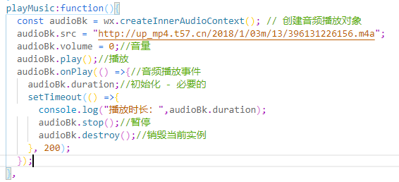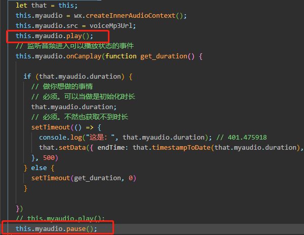 const audioContext = wx.createInnerAudioContext(); const loadDuration = function () { setTimeout(() => { if (audioContext.duration === 0) { loadDuration(); } else { // 获取到正确的duration } }, 100); }; audioContext.onCanplay(loadDuration);