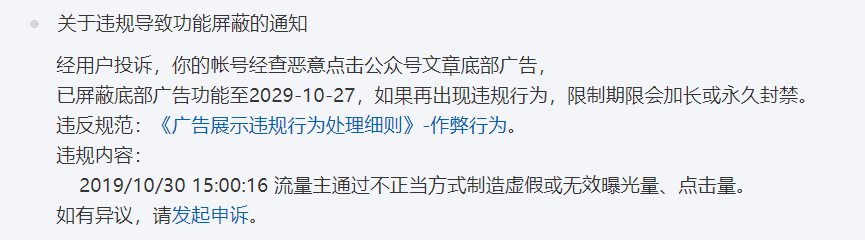 公众号底部广告无辜被封10年,但是并没有恶意点击公众号文章底部广告,之前 确实有过,但是之前得已经封了1个月了,但是 这次是什么都没有做,文章阅读量又不多,怎么可能会恶意点击广告呢,如果 点击了,请问 是不是 阅读数就会增多,但是 我的阅读数并没有增加,烦请官方给个说法,申诉了 直接 说申诉失败,能 给证据吗,真是无语了!