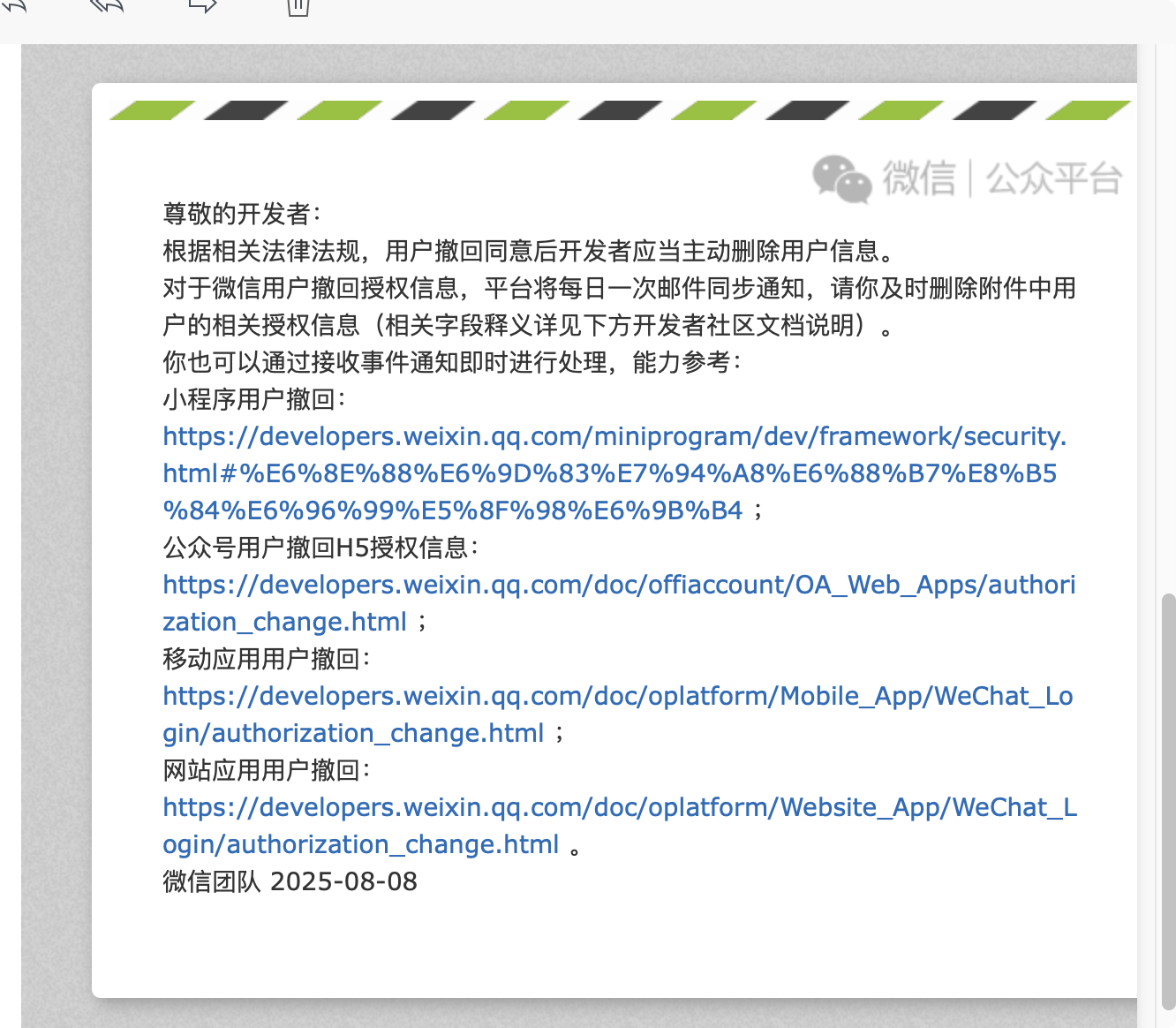 我们今天收到这个邮件,想问下,用户是在小程序或者微信里,哪里操作的什么,才会给我们发这邮件? 另外微信小程序怎么能知道开发者处理没处理呢?