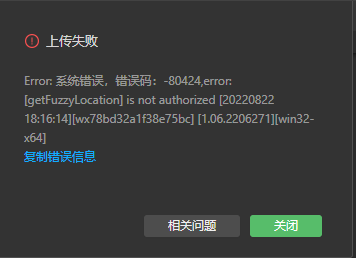 message:Error: 上传失败:网络请求错误 系统错误,错误码:-80424,error: [getFuzzyLocation] is not authorized [20230929 14:02:22][wx90585664c501fcf0]