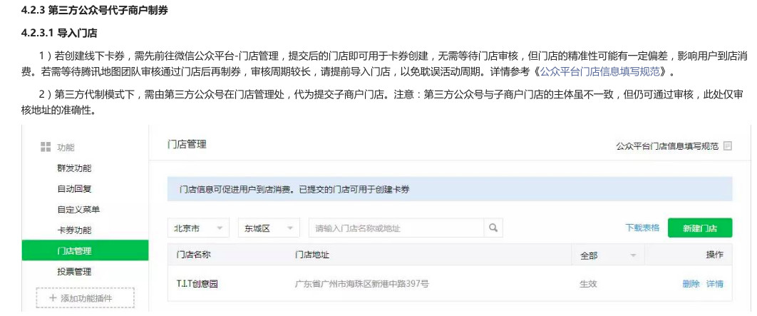 我们是第三方开发者,在为我们的子商户提供代制卡券,在文档指引中,需要我们在公众后台开通“门店管理”(门店小程序)功能,导入门店信息,https://mp.weixin.qq.com/cgi-bin/announce?action=getannouncement&key=1459357007&version=1&lang=zh_CN&platform=2