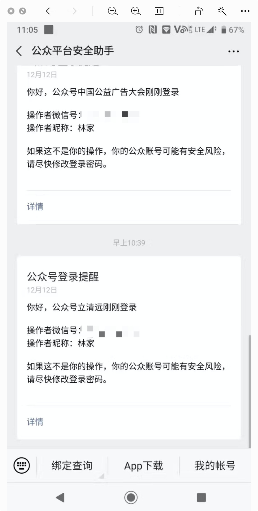 同时我们也关注微信公众号平台,再次确认没有收到任何信息,目前位置就收到2条这样的信息