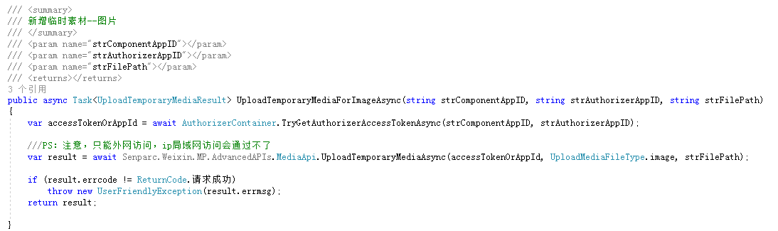 var result = await Senparc.Weixin.MP.AdvancedAPIs.MediaApi.UploadTemporaryMediaAsync(accessTokenOrAppId, UploadMediaFileType.image, strFilePath);