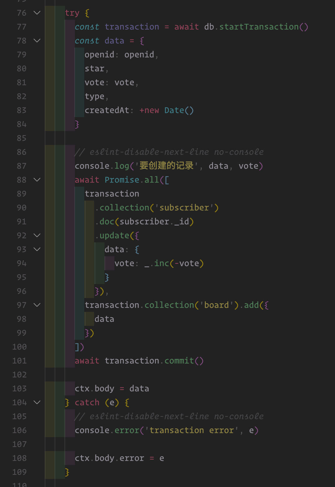 涉及到的事务的代码如下:主要就是将粉丝的可投票数量减掉所投出去的票数。然后在投票台账表上增加一条投票记录。只是两个集合的操作。