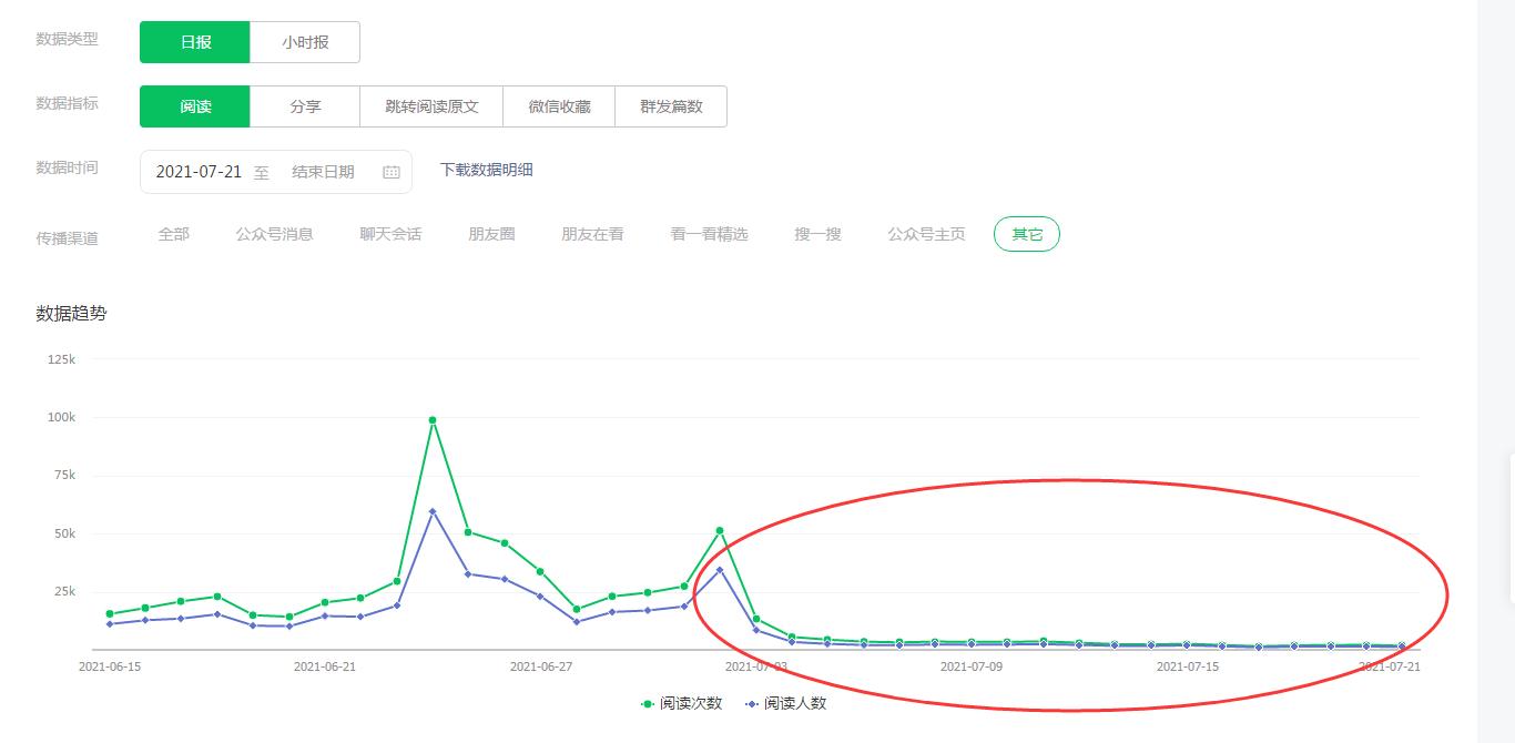 我的微信公众号文章,从7月3号开始,突然没有什么阅读量了,断崖式猛地下跌,之前数据一直很正常,账号从来没有收到任何违规通知,经过2个月的坚持运营,内容和之前相比,也一直维持着一样的质量,试过不标记原创等办法,数据一直没有办法恢复。