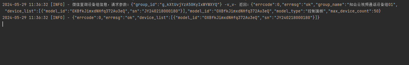 返回:{"errcode":0,"errmsg":"ok","group_name":"知会云视频通话设备组01","device_list":[{"model_id":"OXBfkJimxdNHfq372Au3eQ","sn":"JY240218000180"}],"model_id":"OXBfkJimxdNHfq372Au3eQ","model_type":"控制面板","max_device_count":50}