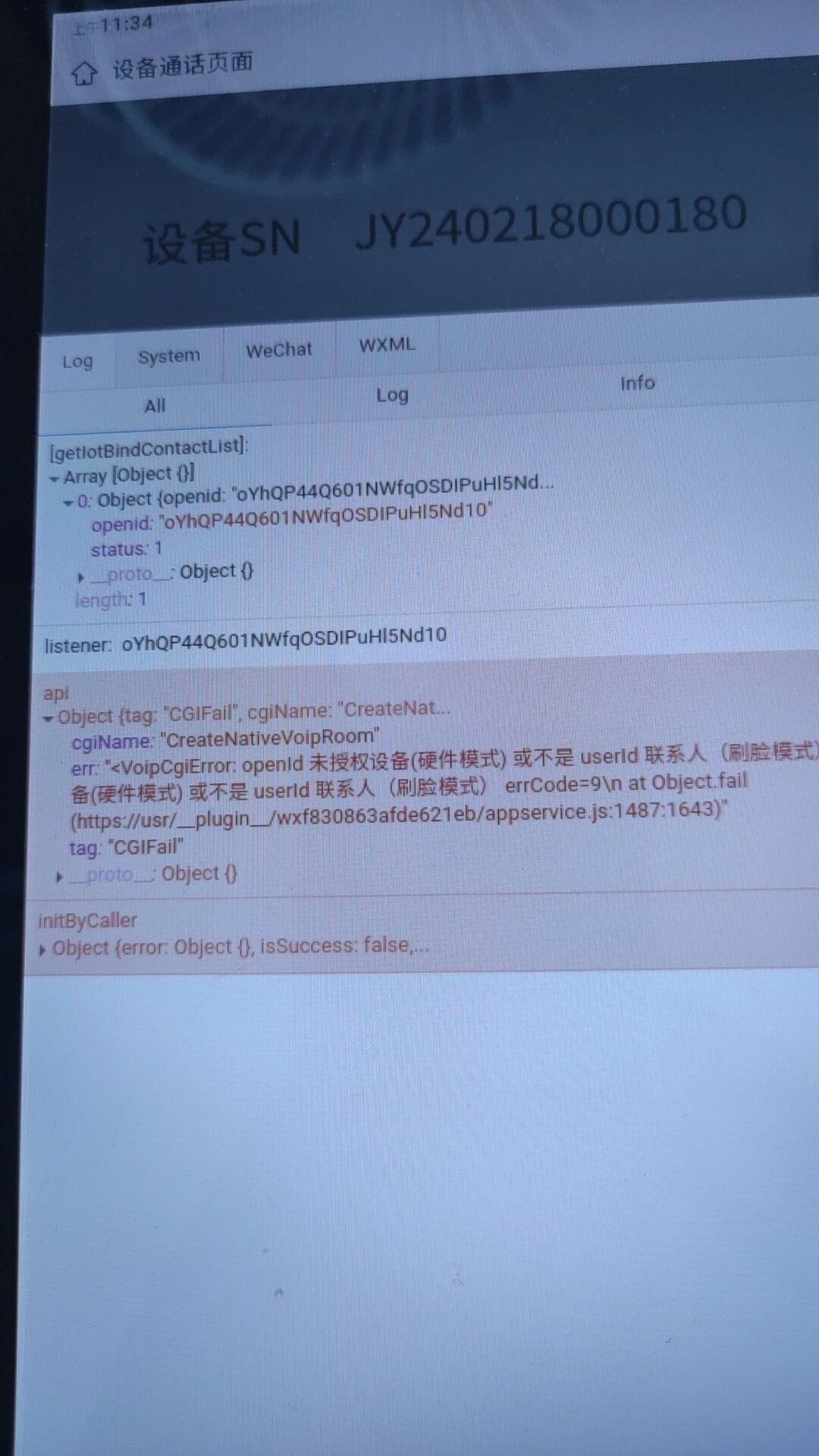 设备端使用wmpfVoip.getIotBindContactList方法查询用户授权状态,状态返回status = 1 已授权,但设备端发起通话失败,返回errCode=9。
