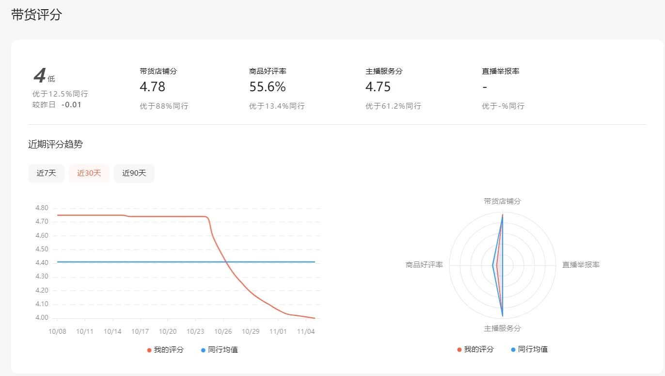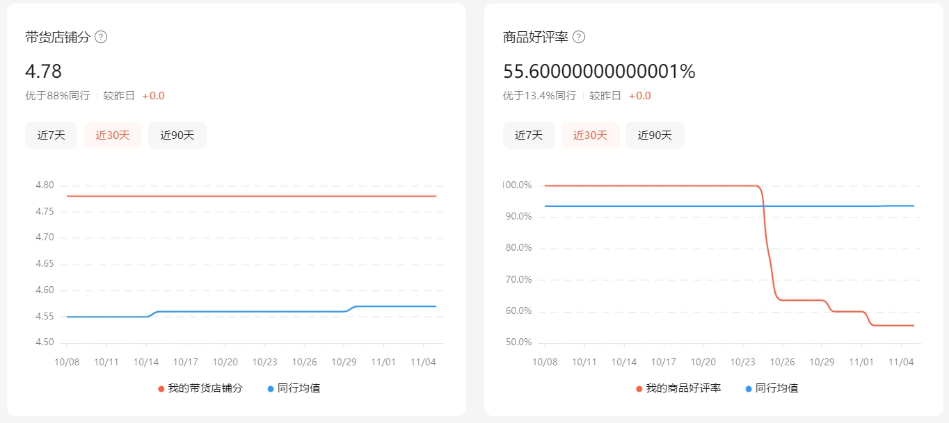 24号的时候突然下滑,除了发了一篇正常的内容之外,没有任何动作,店铺评分也是没有变,只有带货评分里的商品好评率突然下跌,查看了近期订单评价,也没有中差评。人工客服也不知道去哪照,按照平台的运营规则,带货评分低于4.2的时候会有预警,但是我看了平台通知,24号前后两天没有任何预警通知,导致我现在带货评分4分,想投流都没法投