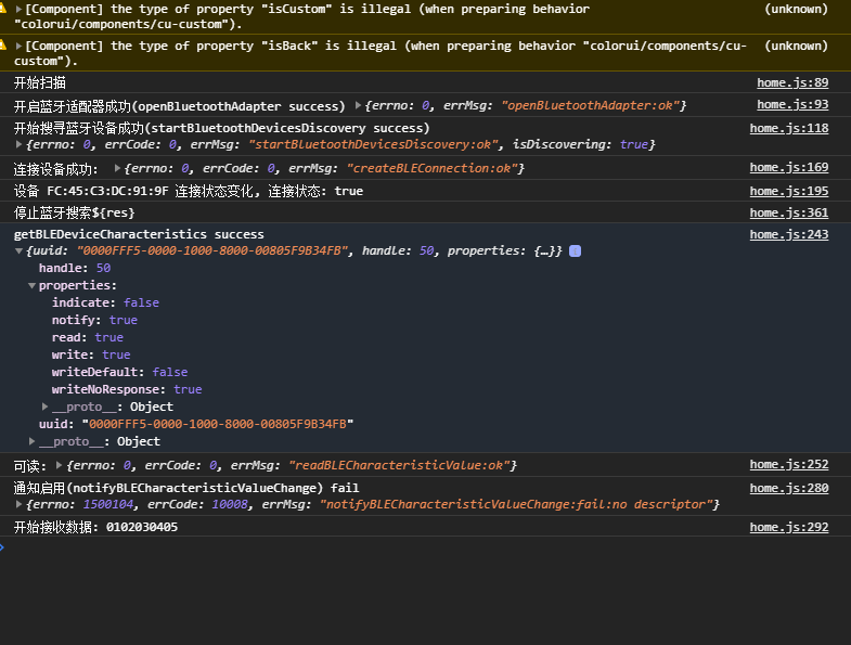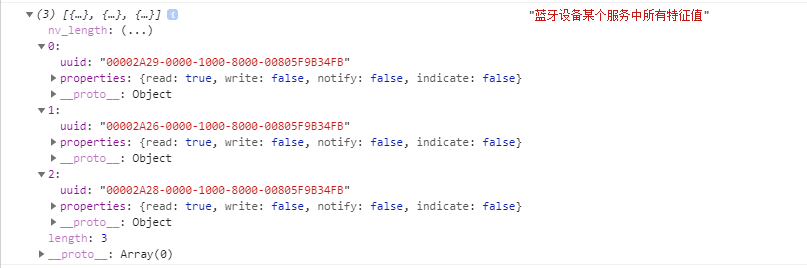 一个蓝牙设备有一个deviceID,使用wx.getBLEDeviceServices()函数可以得到多个servicesID;再写个for循环,将多个servicesID和唯一的deviceID写入wx.getBLEDeviceCharacteristics()函数,每个serviceID都可以得到多个特征值characteristicId,能看到很多的read、write、notify是true的