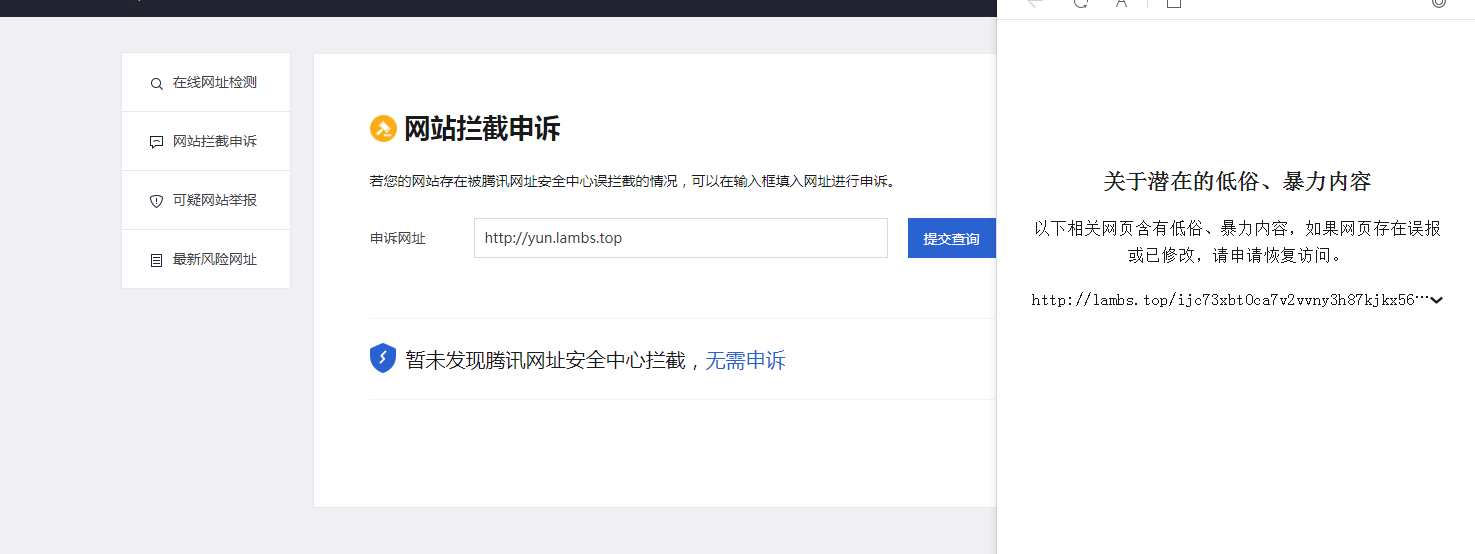 你好,经核实域名yun.lambs.top被手机管家拦截,此处仅处理被微信暂停提供微信内直接访问的服务的外部链接的申诉问题,此服务不在受理范围,请登录手机管家官网【http://gj.qq.com/online_server/complain_url.html】自行申诉,知悉。