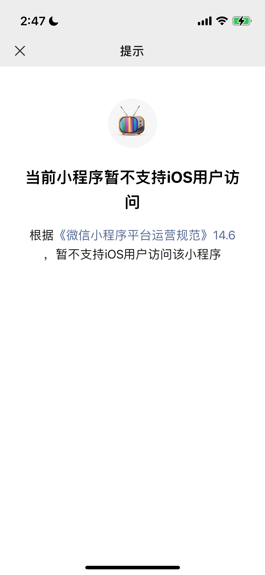 iOS存在虚拟支付,已经被微信禁止使用,使用安卓机访问试试。如果是自己开发的小程序,重新提交小程序审核上架,申请解封。