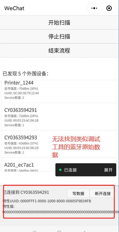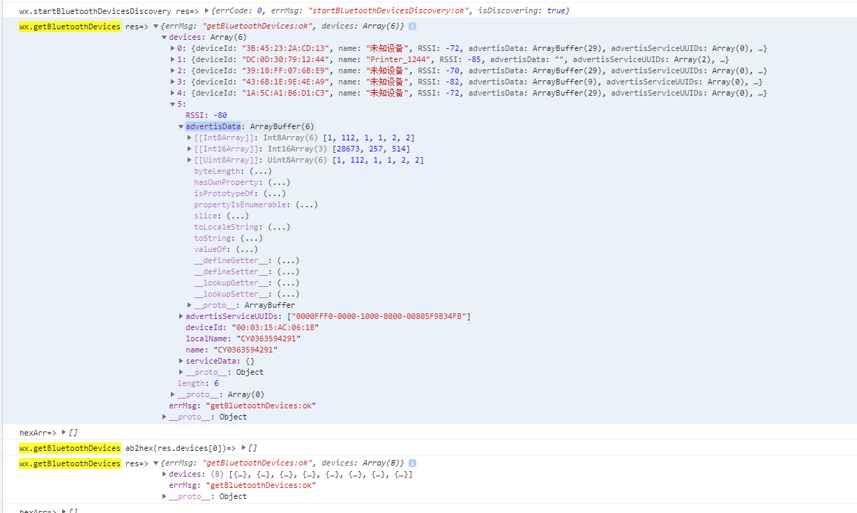 wx.getBluetoothDevices 接口返回的 数据做解析,但是解析的结果跟调试助手显示的数据差太远,无法判断怎么通过小程序获取。请求官方能支持解答。