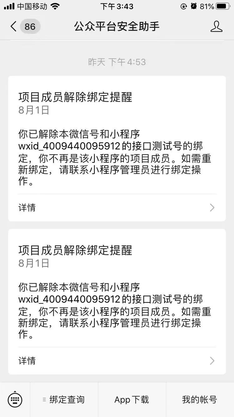 公众平台安全助手,小程序解绑成功后。扫https://mp.weixin.qq.com/,还是项目的开发者。不能添加新的小程序开发者,因为已绑定50小程序了。