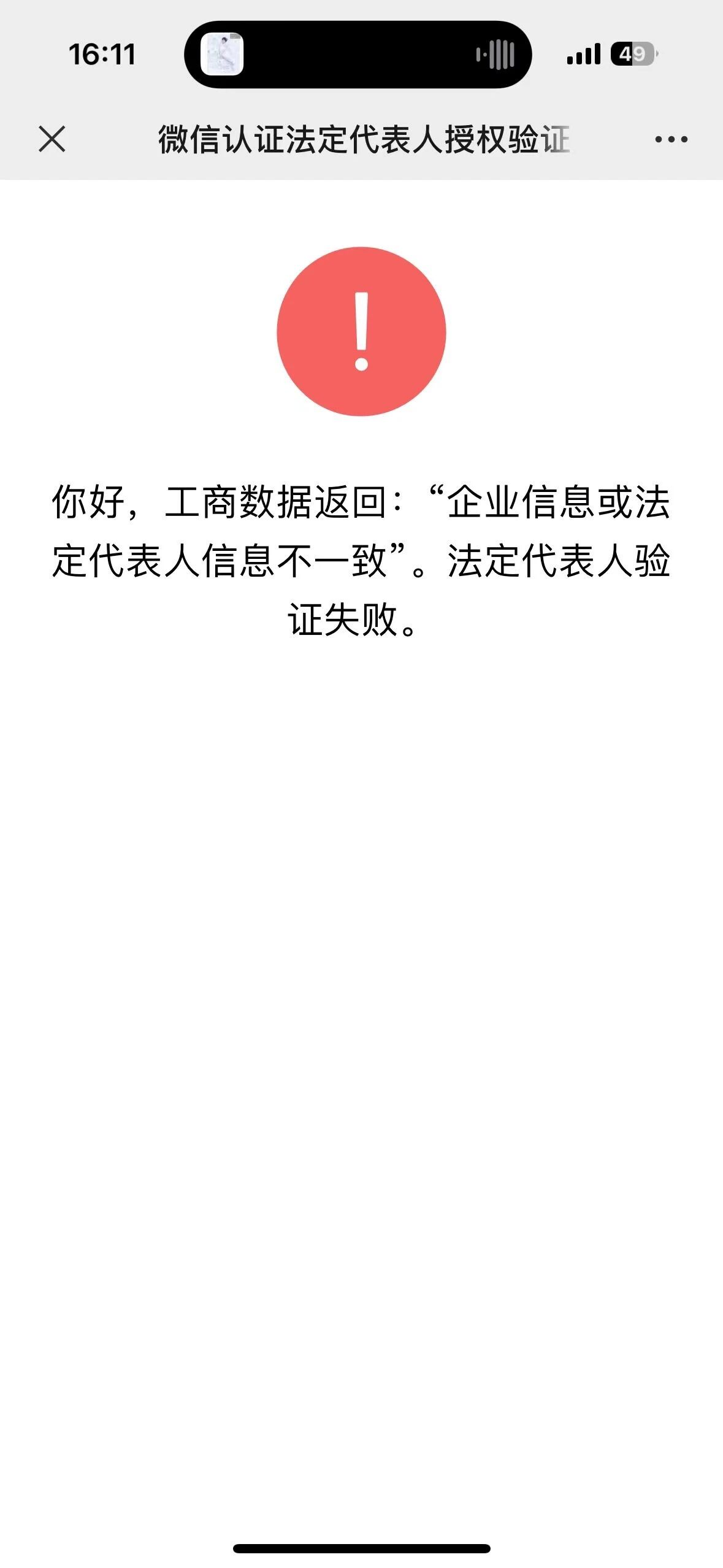 微信认证法人实名微信扫码一直提示这个企业法人代表人姓名不一致,验证失败!