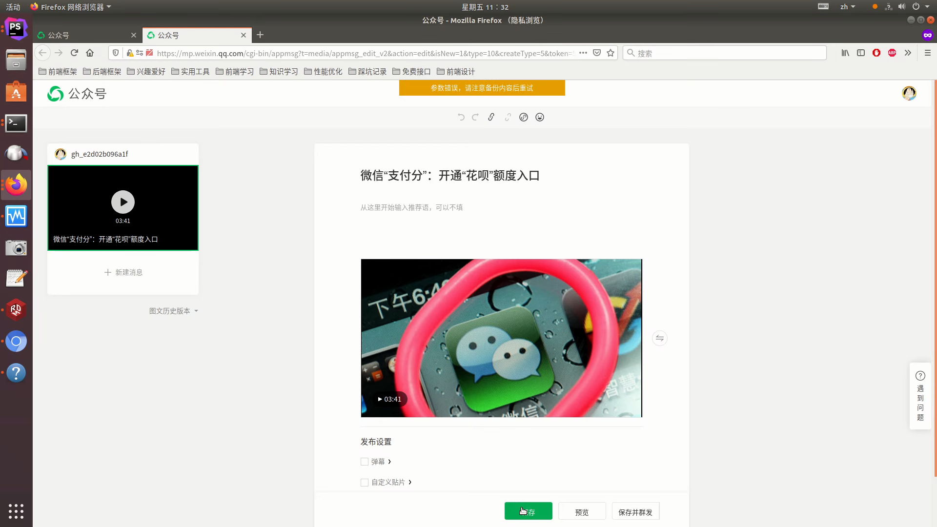 你好,视频是否已上传到了视频库,具体是哪个位置无法保存。建议再次尝试使用无痕模式的浏览器(建议使用Chrome)操作,关闭第三方插件。如果还是有问题,麻烦提供公众号原始ID,操作失败时间点(具体到分钟),操作失败时相关页面截图。