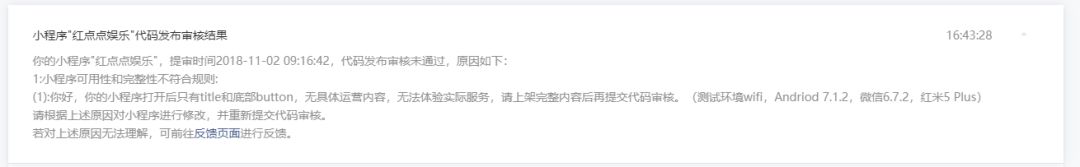 你好,经核实,贵方小程序【首页】版块仍空白,建议在【首页】添加场景使用说明,以供审核人员审核,已经同步反馈审核人员(如图)![]()