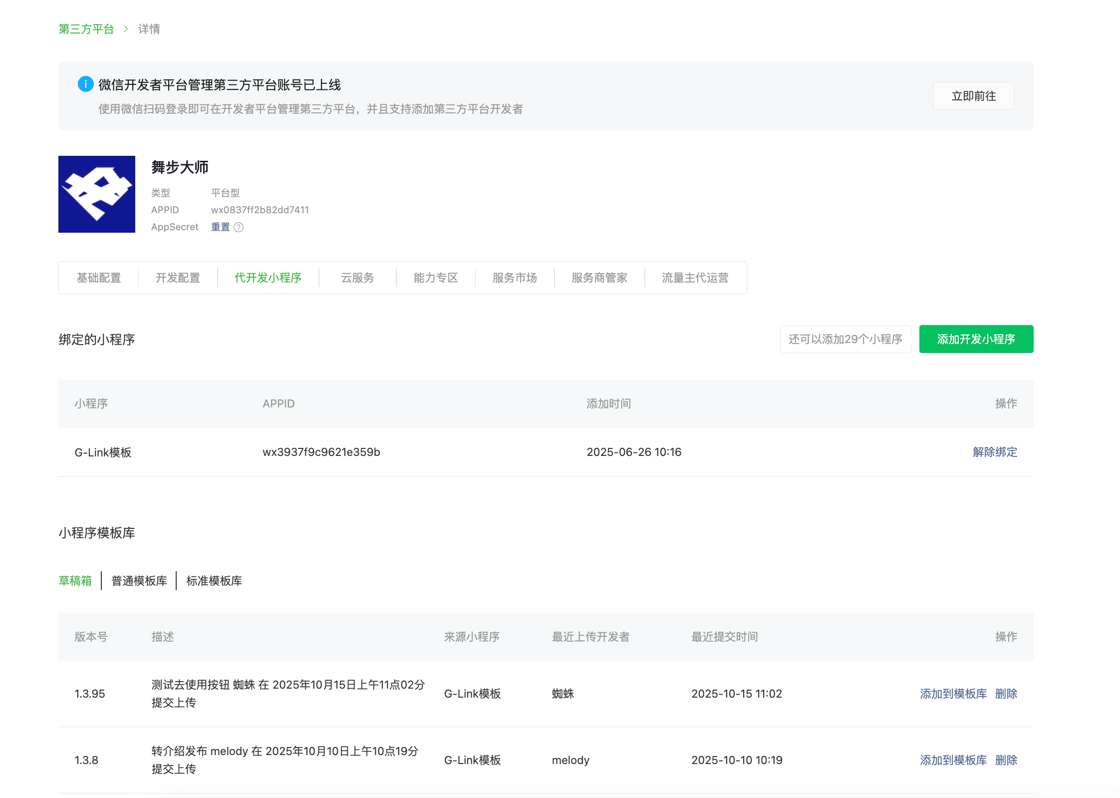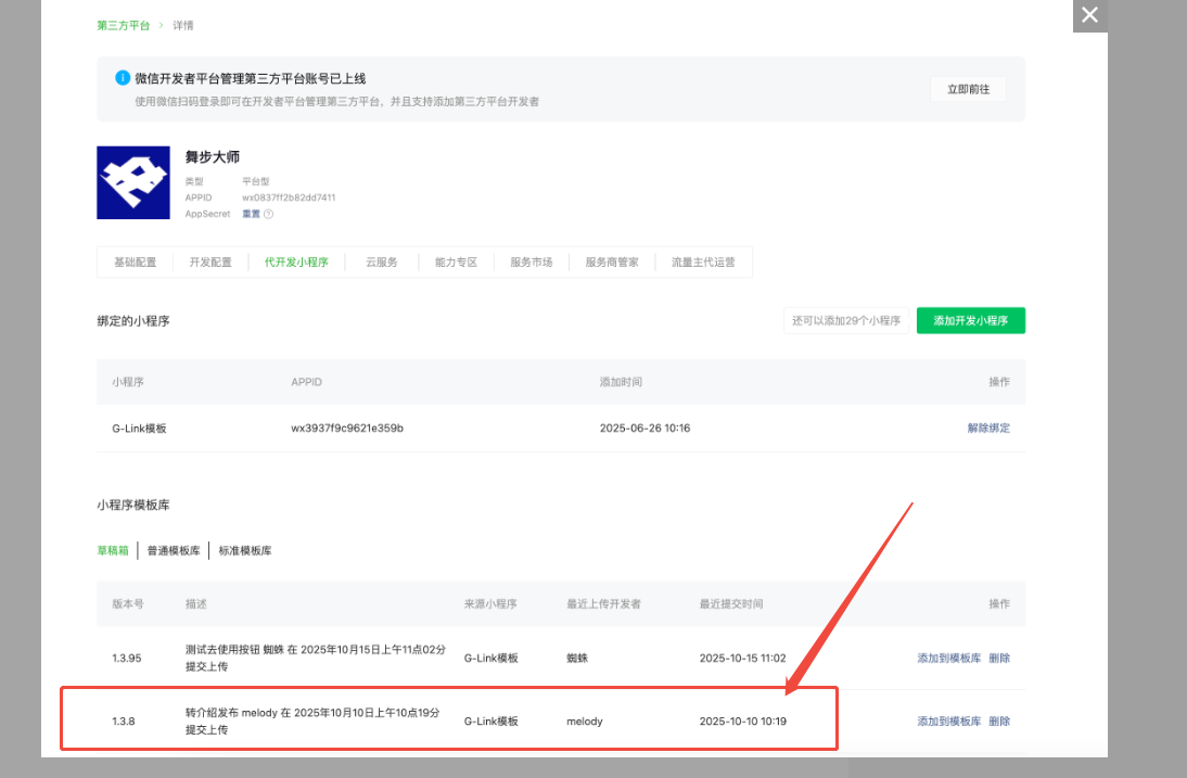 第三方代开发小程序,在开放平台里看到的最新草稿版本号是1.3.95: